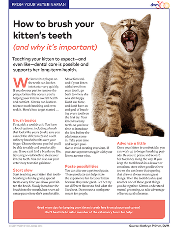 Help your veterinary clients teach their fanged friends to tolerateand maybe even likehaving their teeth brushed.