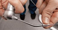 Our dental scaler with a high-speed drill is quite sharp. It can be dangerous if you brush against it, so when it is not in use, we place 30- or 60-ml syringe casings over the top to prevent injuries.