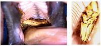 Figure 1. A stick can be seen lodged between the upper dental arcades in the oral cavity of a horse that presented for weight loss over the past week along with a decreased appetite (left); dental abnormalities such as the large hook on the caudal upper cheek tooth (right) can also lead to weight loss and a decreased appetite.