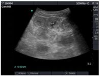 Affected young horses are usually not recognized until they have been infected for one or more weeks. Although they may have mild diarrhea, this is not a consistent finding and the most common presenting complaints are weight loss with a dull attitude (ill thrift). Characteristic findings include marked hypoproteinemia (<3.0 g/dL) in combination with thickened small intestinal walls (wall thickness often >10 mm; normal is <3 mm) detected on abdominal ultrasonography (Figure 2). In addition, more careful palpation of the ventrum often reveals mild to moderate ventral edema. In fact, these findings are nearly pathognomonic for EPE in a weanling or yearling.