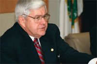 New digs: Executive Board members hashed out issues in the American Veterinary Medical Association's Headquarters Conference Center. In June, Dr. James Cook (above) and other board representatives approved the $1.9-million renovation that includes state-of-the-art technology, flat screens and expanded office space. Cook has since announced his candidacy for 2007-2008 AVMA president-elect. (Photo: American Veterinary Medical Association)