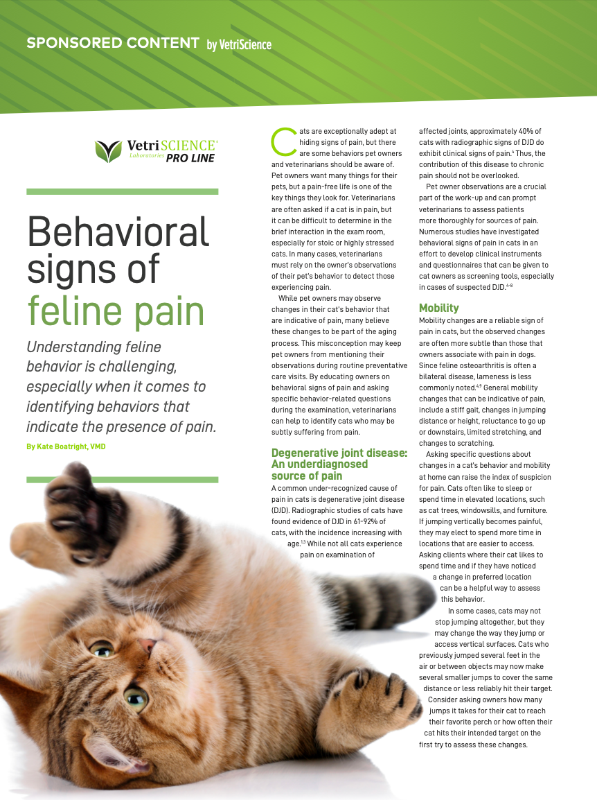 Educating pet owners on behavioral changes that may indicate pain is an important part of the veterinary team’s job in advocating for their feline patients. Educational tools are available from organizations such as the International Veterinary Academy of Pain Management (IVAPM). Veterinarians should also discuss ways to help cats with their mobility before they are showing overt signs of pain. Recommending joint supplements to senior and geriatric cats is a great way to do this.