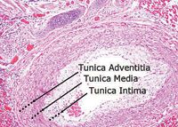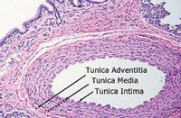 2. A photograph of a cross section of a canine pulmonary artery in a patient with documented pulmonary hypertension. The tunica adventitia and intima layers are both thickened, supporting the clinical diagnosis of pulmonary hypertension (hematoxylin-eosin stain; 10X magnification). (Image courtesy of Pam Mouser, DVM, MS, DACVP, Angell Animal Medical Centerâs Department of Pathology.)