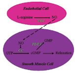 Nitric oxide is synthesized in endothelial cells from L-arginine and oxygen by the enzyme nitric oxide synthase. Once produced, nitric oxide is released by the vascular endothelium and travels to smooth muscle cells. There, nitric oxide stimulates the enzyme guanylate cyclase, which catalyzes guanosine triphosphate conversion to cyclic guanosine monophosphate (cGMP), leading to an increase in cGMP concentrations. cGMP inhibits calcium release from the endoplasmic reticulum and causes pulmonary vasodilation (Figure 3). Vasodilation is limited by phosphodiesterase 5 inactivation of cGMP.1 Nitric oxide also inhibits platelet activation and smooth muscle cell hypertrophy.10