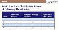 While the clinical classification scheme groups pulmonary hypertension patients into classes based on the underlying cause of pulmonary hypertension, the functional classification scheme groups these patients into classes based on the severity of pulmonary hypertension-induced clinical signs (Table 2). This schematic was also developed at the 1998 WHO Evian meeting and is used in human medicine to help determine when to institute therapy, to decide which treatments may be most beneficial, and to provide an objective treatment goal.25 Although not explicitly evaluated in dogs, the information can be easily extrapolated from people to dogs.