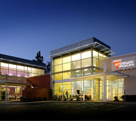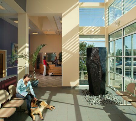 The original Upstate Veterinary Specialists and Emergency Clinic was in this first generation of specialty hospitals and won the 2003 Veterinary Economics Hospital of the Year award. Several years later, the expanded Upstate facility (above) grew to be 24,000 square feet and represented the zenith of the trend toward client-friendly facilities. This project featured three glass-walled, sunlight-filled atriums, complete with stone fountains (see below).
