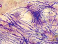 Photo 1: Aspergillus sp hyphae from a nasal flush in an Amazon parrot. 100x.