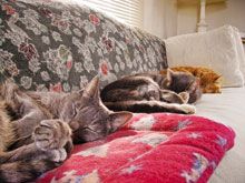 Smudge, Fox and Cleo, relaxing on the couch. The practice where I work today offers extensive alternative care options for pets, so we see a lot of chronically and severely ill patients. Sometimes we are their last hope. Fortunately for me, most of my work is done behind the scenes with management and team members, but I do still assist with clients and patients at the desk. Seeing the pets struggling with kidney failure, sinus tumors, stomach cancer, heart failure, lymphoma and spinal malformations is heartbreaking in a way it never was before. So I try to focus on the good that we're doing-providing comfort for whatever time that pet may have left.