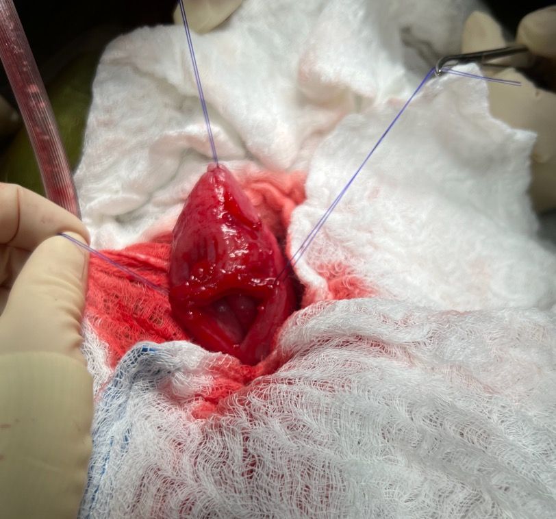 One challenging aspect of performing a cystotomy to remove calculi is maintaining visualization. In conjunction with this, urothelium is a sensitive tissue and quickly becomes edematous with manipulation. The creative use of stay sutures can facilitate visualization and decrease frustration with the procedure. When performing a cystotomy, the placement of not only the stay suture at the apex but also one on either side of the cystotomy can aid in visualization of the trigone and proximal urethra (Figure 2).