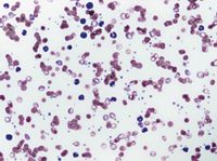 2. A peripheral blood smear from an anemic dog reveals that the RBCs are prominently clumped together, which indicates agglutination. A saline dispersion test should be performed for confirmation. Additional findings in this smear include moderate polychromasia and rare nucleated RBCs, which indicate a regenerative response, small round cells lacking central pallor suggestive of spherocytes, and a neutrophilic leukocytosis, which indicates inflammation (Wright's-Giemsa stain; 500X).