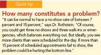 Dr. Rothstein agrees that a charge isn't likely a cure-all. "If new reminder systems and scheduling techniques don't solve the problem, the threat of a bill for a no-show probably won't be the antidote either," says Dr. Rothstein. "The client is most likely a bad fit for your practice."