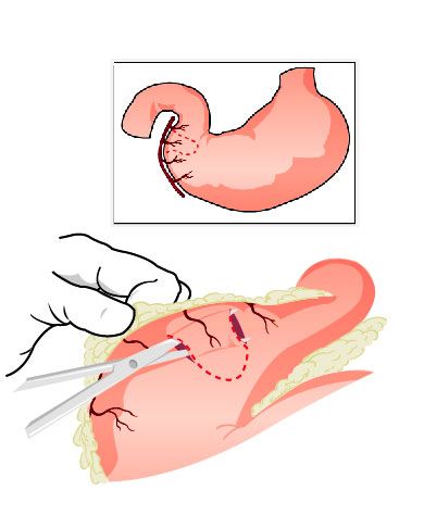 Create a 3- to 4-cm-long by 3- to 4-cm-wide seromuscular flap in the pyloric antrum. The dissection should be between the muscularis layer and the submucosa. Incorporate one or two branches of the right gastroepiploic artery into the flap.