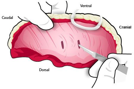 Make two small transverse stab incisions 3 cm apart into the parietal peritoneum and transversus abdominis muscle. The incisions should be 2 to 3 cm caudal to the last rib and 2 to 3 cm long in the ventral one-third of the right abdominal wall.