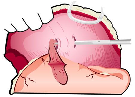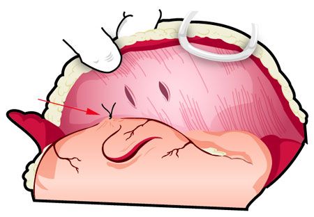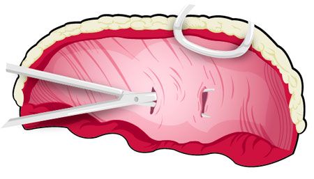 Suture the seromuscular flap back into its original position by using a 3-0 absorbable monofilament suture with a simple interrupted suture pattern.