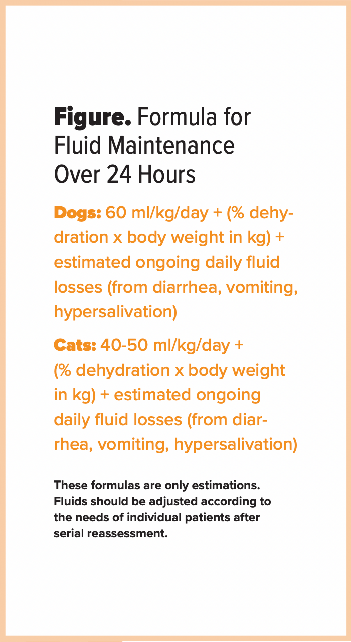Symptomatic care is of the utmost importance. Many intoxicated patients experience significant fluid loss owing to vomiting, diarrhea, and hypersalivation or to the sorbitol found in activated charcoal. Hypovolemia may be treated with isotonic crystalloid fluids as boluses of 10 to 20 ml/kg over a period of 15 minutes. For dehydration, the dose of crystalloid solutions should be calculated according to the formulas shown in the Figure.