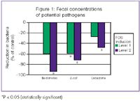 Fresh fecal samples were collected at four days and at one day before the test period and then on test period days 14 and 28. Collected samples were analyzed using conventional microbiological plating techniques for the following potentially pathogenic intestinal bacteria: bacteroides, Escherichia coli, eubacteria, and Clostridium perfringens and for the beneficial bacteria lactobacilli. The mean bacterial concentration from the samples taken four days and one day before the test period from each dog was used as that dog's control value. By using a repeated measures mixed linear model, these control values were then compared with values from test period days 14 and 28 and with the mean value for these two days; P < 0.05 was considered significant. Results from the test period were expressed as mean percent change from the control value.