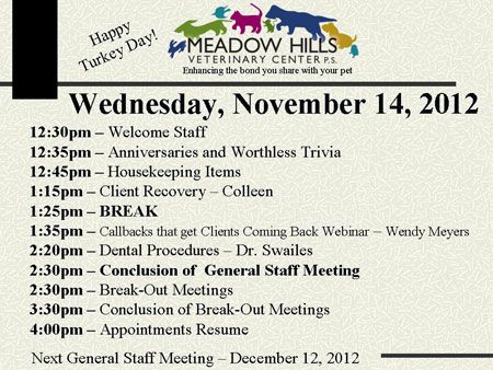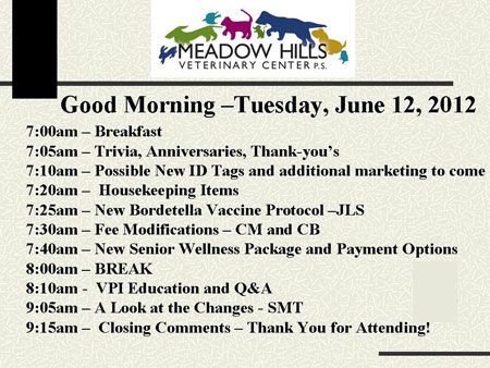 A crucial step in leading the perfect team meeting is creating an agenda that suits your staff. Here are two examples of meeting agendas created by Brian Conrad, CVPM, practice manager at Meadow Hills Veterinary Center in Kennewick, Wash.
