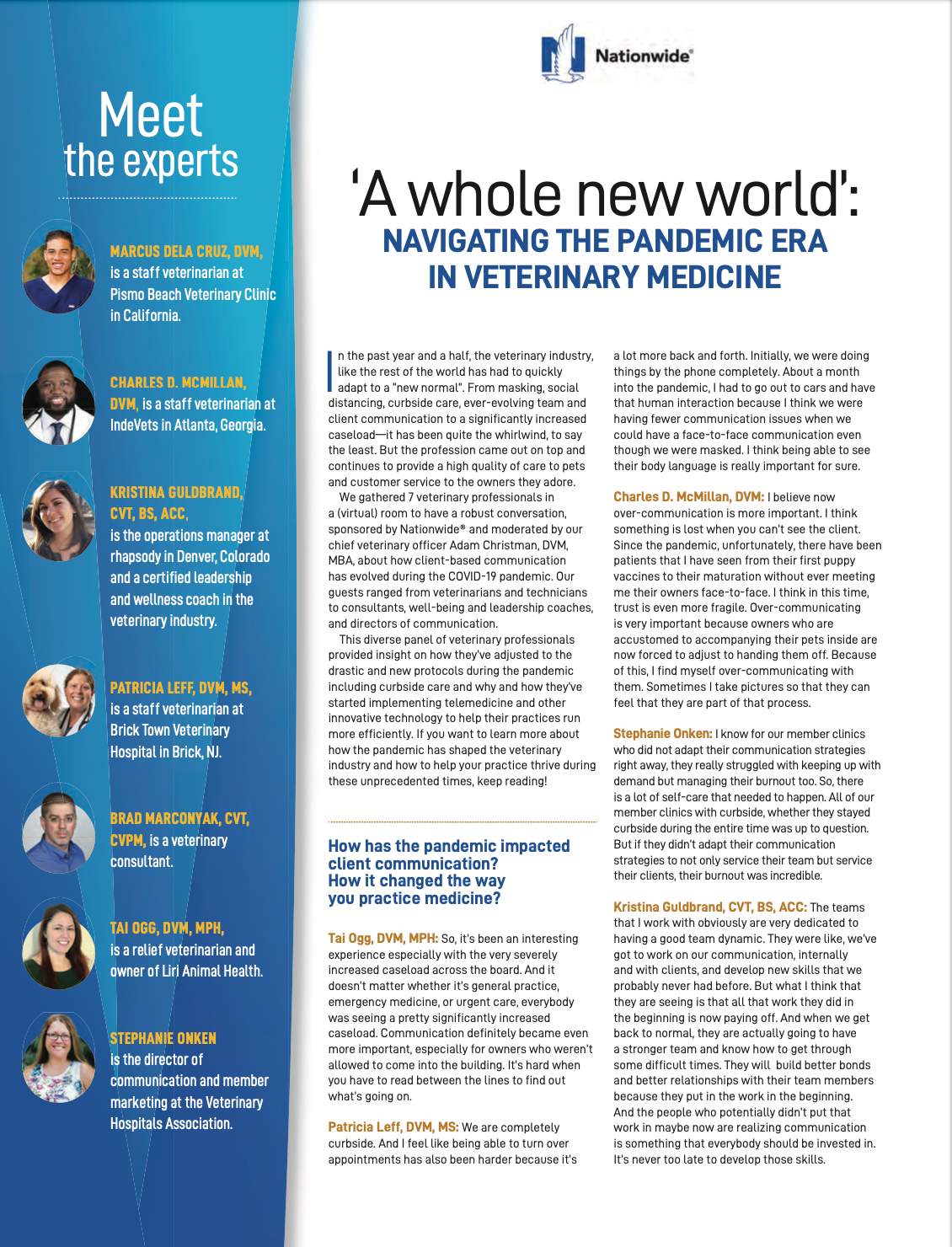 We gathered 7 veterinary professionals in a (virtual) room to have a robust conversation, sponsored by Nationwide® and moderated by our chief veterinary officer Adam Christman, DVM, MBA, about how client-based communication has evolved during the COVID-19 pandemic. Our guests ranged from veterinarians and technicians to consultants, well-being and leadership coaches, and directors of communication.