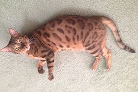When Barbara Von Holleben and her family of Oldsmar, Florida brought home their first Bengal cat, they fell in love and decided to bring home a few more. The family is fans of literature, so they named their first cat Romeow, and their second cat, a female was named Juliet. To keep the trend going they realized their story wouldn't be complete without the surname of the writer Shakespeare. After a few pun-filled modifications, the group settled on Shakespurr.