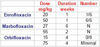 Assume that an isolate resistant to one FQ is resistant to all. If resistance emerges to FQ, it will be multidrug resistance. Thus, the fluorquinolones preferably are reserved as second tier drugs with use based on culture and susceptibility; use at the highest dose is preferred. As concentration dependent drugs, doses of FQs should be designed to reach at least 10 X the MIC of the infecting bug at the site of infection Ciprofloxacin oral bioavailability in dogs is 40 to 60% and in cats, 0-20%. Although ciprofloxacin is more potent toward Gram negative organisms, the dose should nonetheless be increased two fold compared to enrofloxacin, and 3 fold for Gram positive. Oral ciprofloxacin shold not be used in cats. For other fluoroquinolones in cats, marbofloxacin and apparently orbifloxacin are among the safest in regards to retinal degeneration.