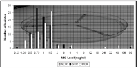 We have demonstrated the efficacy of fosfomycin toward MDR E coli. Fecal E. coli isolates exhibiting NDR (n=50), SDR or MDR (n=25 each; isolates resistant to 14/16 drugs on the antibiogram) or non-resistant (n=50) fecal E coli (see Background) were subjected to fosfomycin E test. Isolates were obtained either from an experimental study in which multidrug resistant fecal E. coli were induced following administration of enrofloxacin (5 mg/kg/day PO for 7 days or from an ongoing surveillance study in partnership with IDEXX laboratories (1000 isolate E. coli isolates/year from dogs or cats with spontaneous disease). Thus low or high level resistance can be detected because concentrations exceed the resistant breakpoint MIC (MICBP). The fosfomycin breakpoints are < 64 mcg/ml (susceptible) and > 128 mcg/ml (resistant). The distribution MIC for fosfomycin for all of the isolates, regardless of the t ype of resistance (NDR, SDR and MDR) was well below the susceptible breakpoint (< 64 µg/m) for fosfomycin. The MIC range was 0.25 to 4 µg/ml; the MIC 50 and 90, were, respectively, 1 and 1.5µg/ml, respectively, except for MDR, for which MIC90 was 2 µg/ml. The data suggests that MDR E coli should remain susceptible to fosfomycin. We also have determined the pharmacokinetics of fosfomycin tromethamine, the commercially available drug, when administered as a single oral dose of 80 mg/kg (Figure 3).