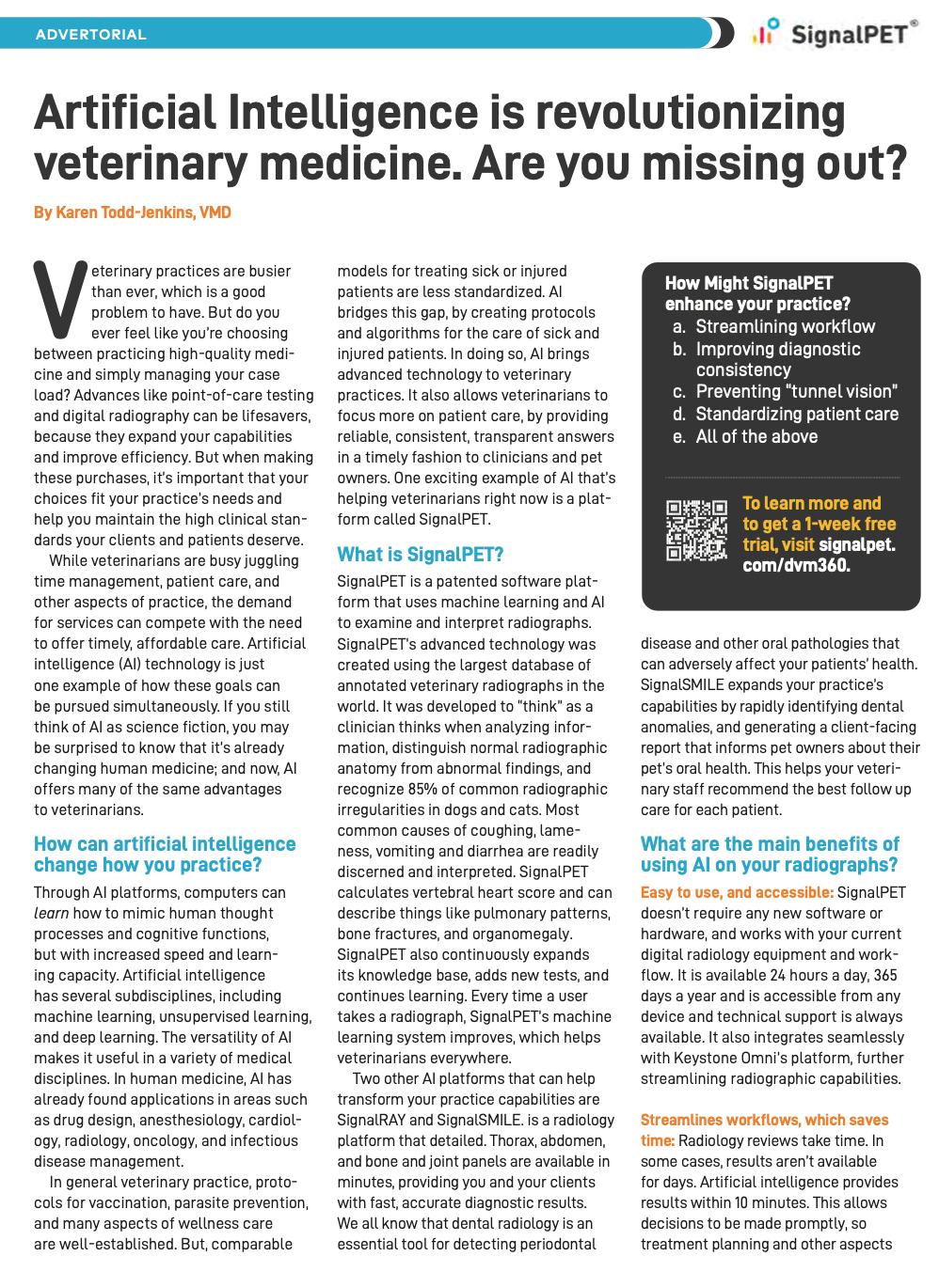 In-house and point-of-care diagnostics have become commonplace at many veterinary practices. Twenty-five years ago, it was probably hard to believe how heavily clinicians would rely on these advances, which have become our new normal in many ways. In a similar way, AI has already been incorporated into human medicine, and it appears to be part of the future for veterinary practice, too.