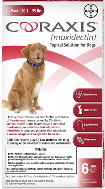 Bayer Animal Health has announced the launch of Coraxis (moxidectin) Topical Solution for Dogs, a prescription-only, monthly transdermal product that prevents heartworm disease and treats and controls hookworms, roundworms, and whipworms in dogs.