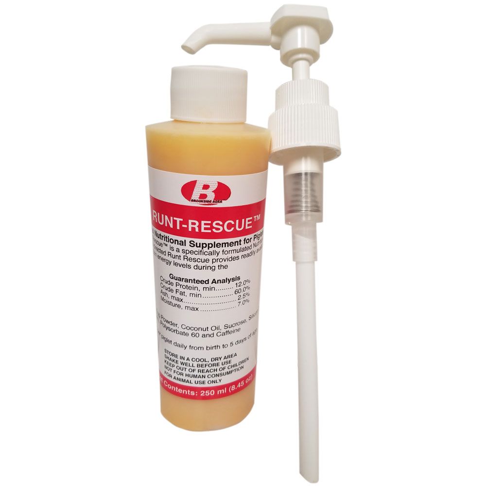 Runt-Rescue is a fast-acting, efficient nutrient supplement for weak, newborn piglets with a birth weight under 2 pounds. This liquid product is given right after birth to help reduce mortality in large litters and provide small piglets with the necessary energy boost to suckle and thrive.