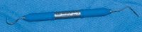 Figure 1. This Marquis color-coded periodontal probe (right), marked in 3-mm increments, is used to measure periodontal attachment loss. The shepherd's hook explorer at the opposite end (left) is used for discovering tooth defects such as cavities and fractures.