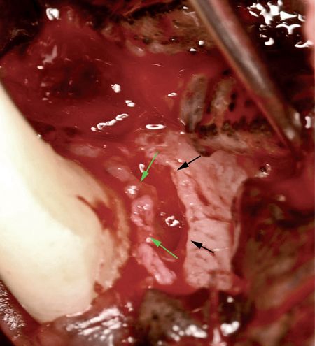 Photo 11: Exposure of granulation tissue (green arrows) filling the palatal defect (black arrows).