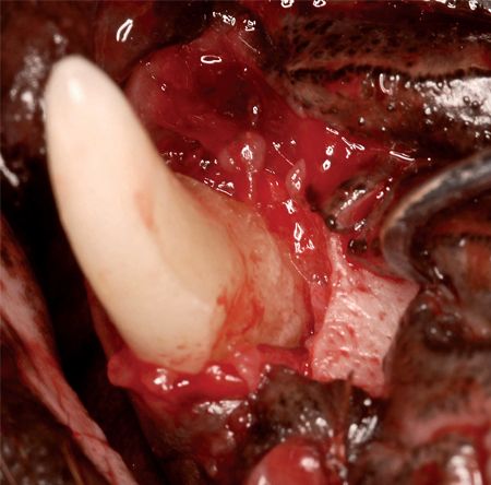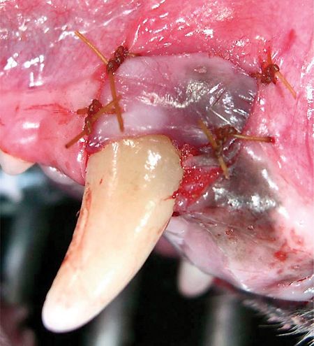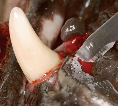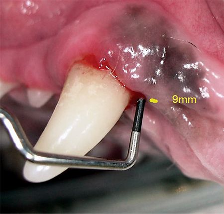 Palatal pocket therapy is indicated in cases in which there is more than 25 percent attachment loss on the palatal aspect of one or both maxillary canine teeth and the periodontal probe does not enter the nasal cavity (Photo 9). If untreated, the pocket might progress until it penetrates the nasal cavity, creating an oronasal fistula.