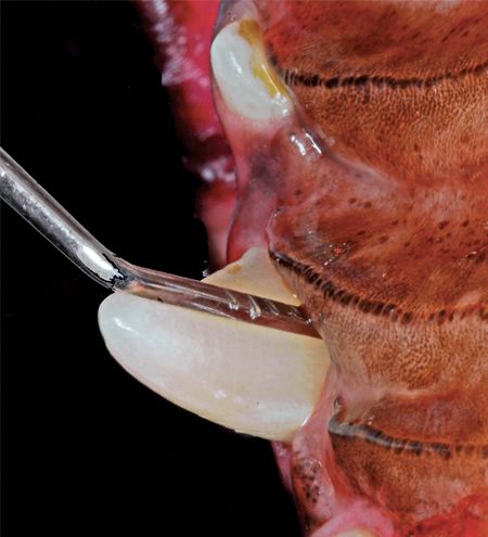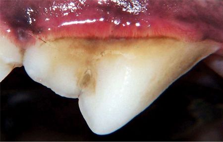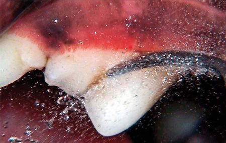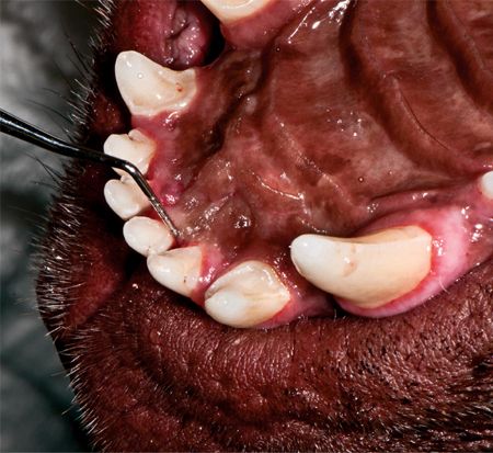 Photo 5: A 4-mm periodontal pocket between the right and left maxillary first incisors in a German shorthaired pointer.