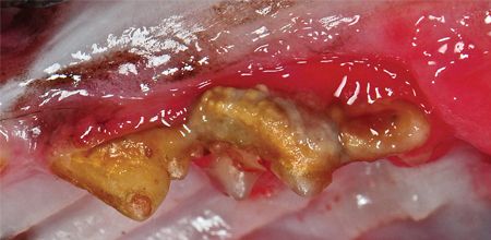 The goals of bone grafting are to restore normal bony architecture, re-establish the periodontal ligament and soft tissue and prevent further periodontal pocket formation. Many materials have been used for dog and cat bone grafts including autogenous bone, allografts from companion animal bone (e.g., Osteoallograft Periomix — Veterinary Transplant Services) and synthetic bioactive glass ceramics (e.g., Consil, Consil Putty — Nutramax Laboratories), which become osteoconductive when implanted into an osseous defect. The ceramic is resorbed within weeks.