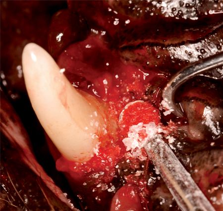 Carry bone-grafting particles into the cleaned defect (Photo 13).