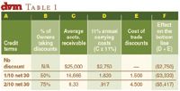 Let's assume billing average totals about $25,000 per month. About 50 percent of Doe's clients would take advantage of a 1 percent discount and 75 percent would take advantage of a 2 percent discount, while the rest pay within 30 days.