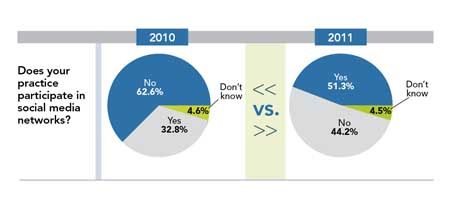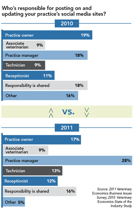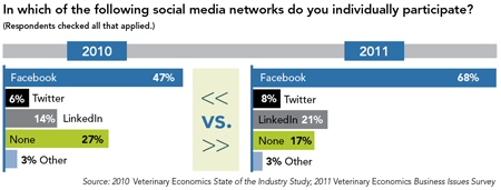 New data from the 2011 Veterinary Economics Business Issues Survey shows that more than half of veterinarians have jumped on the social media bandwagon and are using sites like Facebook, Twitter, and LinkedIn to promote their practices. The rest of you are still living in 2010, when less than a third of veterinarians said their practices participated in social media. See the charts below to check out how the times have changed.