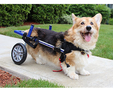This dog wheelchair is specifically designed to fit corgi dog breeds, known for their long bodies and short legs.