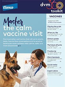 Click the image to download the PDF file of the dvm360 vaccines toolkit.This dvm360 toolkit focuses on pet vaccinations. This special package of articles, tips, handouts and tools is designed to make it easy for your team to educate pet owners about the importance of vaccinations in preventing disease and keeping pets healthy, safe and happy.