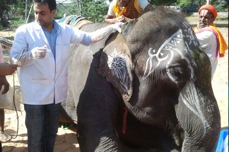 Mayank Lamba, DVM, attends to an elephant with a severe abscess.
