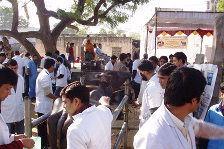 Veterinary students assist clinicians at a farmers' fair at Nayla Village in India.