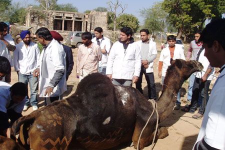 Apollo College veterinary students examine a camel with impaction in Dayarampura Village in India.