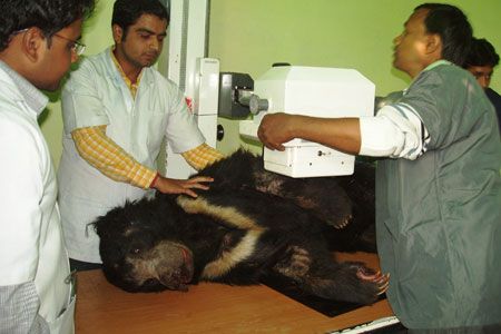 Rakesh Mishra, DVM, takes a radiograph of a bear with a fractured elbow.