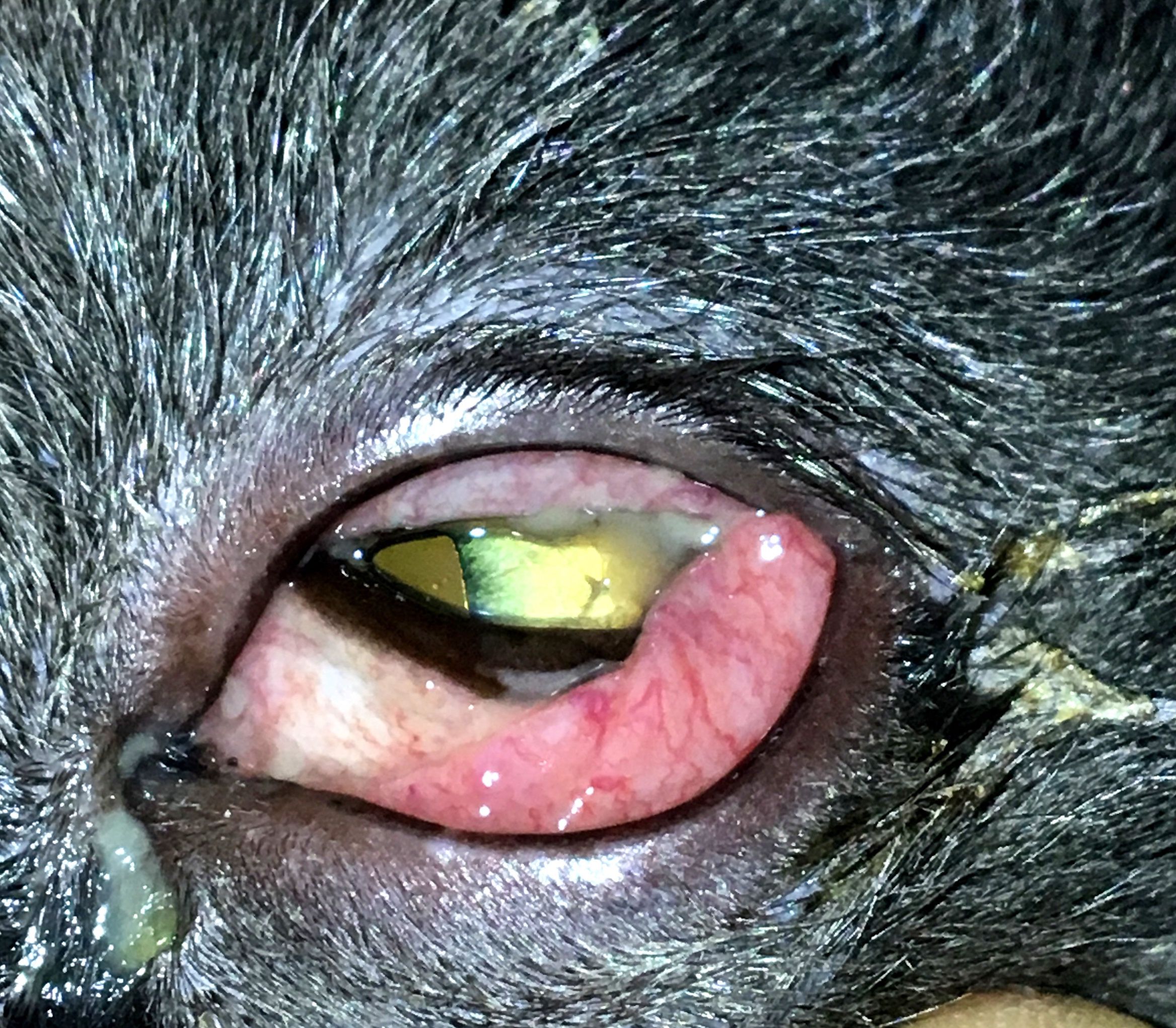 FHV-1 is characterized by greater conjunctival hyperemia and amounts of ocular discharge than C felis (Figure 1). Also, the signs of respiratory disease are usually more severe in FHV-1, especially during the primary disease. Recurrent disease, keratitis, and corneal and conjunctival ulceration are definitive hallmarks of FHV-1 infection (Figure 4). Consequently, the presence of symblepharon, or adhesions between the cornea and conjunctiva, indicates previous FHV-1 disease (Figure 5). On the other hand, the chemosis is much more severe in C felis cases and is the most notable clinical sign (Figure 2). Although the C felis is rather mild and may resolve, chlamydial conjunctivitis can be very persistent, especially if untreated.