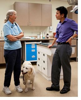 The surgeons are all pleased with the progress Mica has made and will continue to monitor her annually to ensure that she is using the leg well. "The most recent evaluation showed that her affected hind leg is gradually approaching the level of her normal hind leg," says Kim (shown at left chatting with Mica's owner, Kathleen Hornsby).