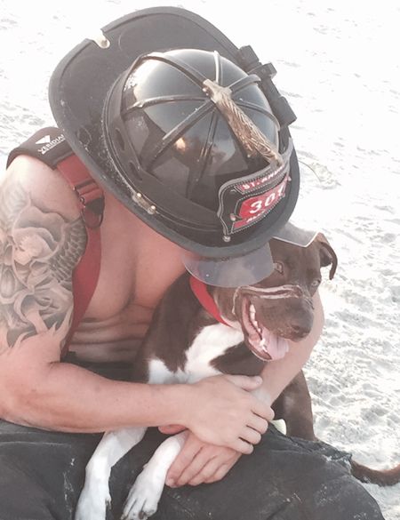 Caitlyn and Firefighter Josh Allen spend some time bonding before their cuddle session in front of the camera for the 2016 Charleston Area Firefighter Calendar. Photos courtesy of Charleston Animal Society.