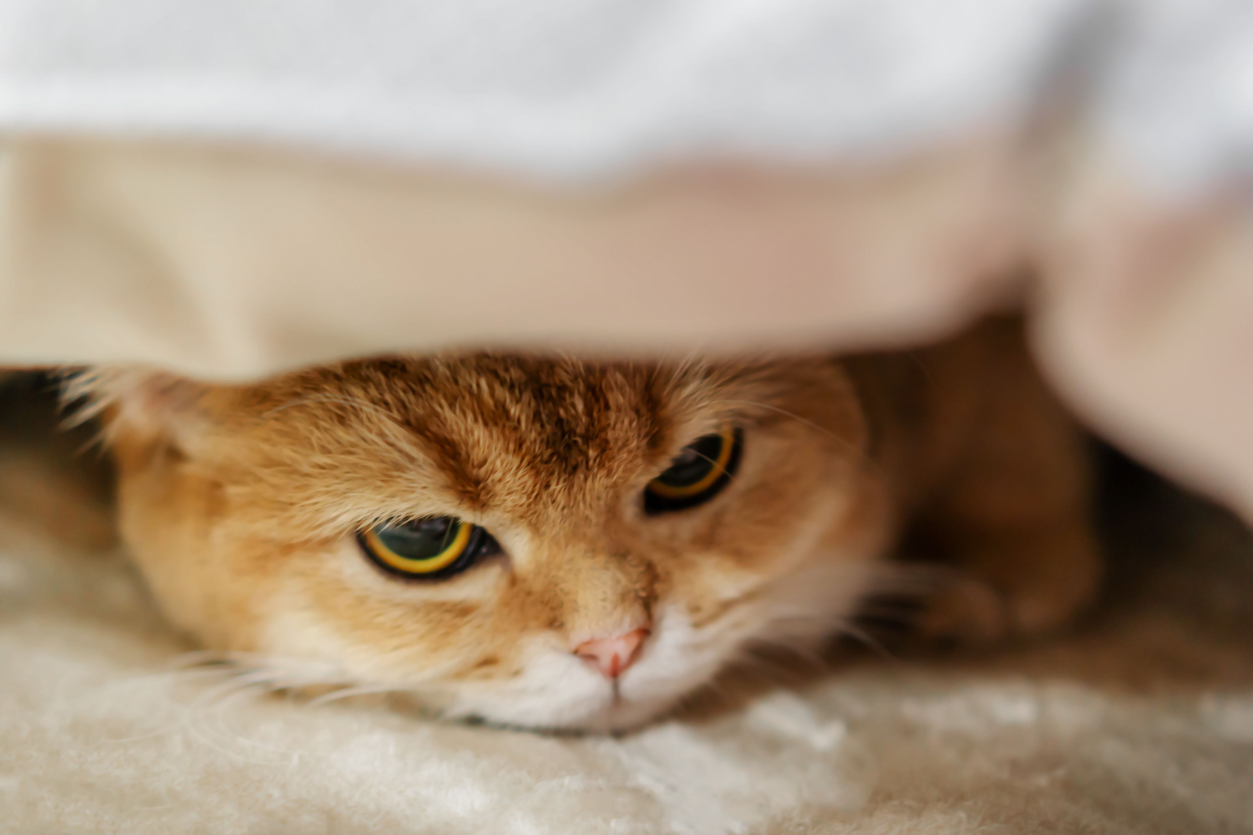 Other cats may exhibit social-related responses, like hiding, freezing, fidgeting, or fleeing, according to Restine. Additionally, chronic bacterial infections or flare ups can be indicators of stress, as well urinating outside the box and chronic sneezing.