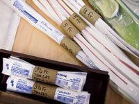 To organize red rubber and tomcat catheters, we use the inside cardboard tubes from flexible, self-adhering bandages to contain the catheters and keep like sizes together for easy access.