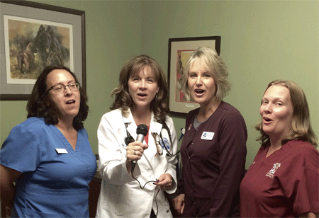 Team karaoke is always great fun. We have an inexpensive karaoke machine that belongs to the hospital. At team meetings, staff members are split into teams and asked to write new lyrics to any song about our veterinary hospital or about a client education subject.