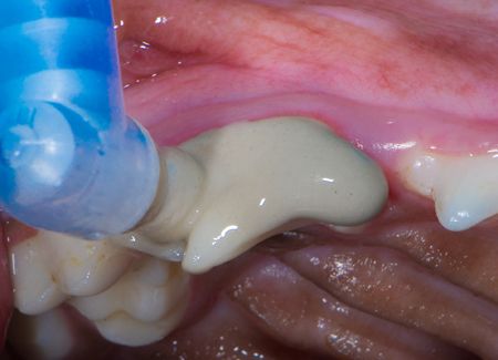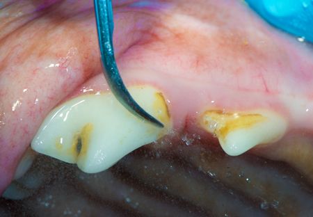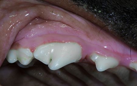 Despite the discoloration, Gus has the first-and easiest to fix and prevent-stage of periodontal disease: gingivitis. Specifically, she has marginal gingivitis secondary to plaque-covered calculus.