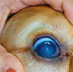 A 45-day-old male cocker spaniel was presented for its first puppy examination. During the clinical examination, I noticed a lesion on the dog's right eye (see photo). The cornea was rough and had increased opacity, especially in the center where the color was white and blood vessels were noted. The person who sold the dog to the owners told the them the dog had had this lesion since he opened his eyes and that it would go away.